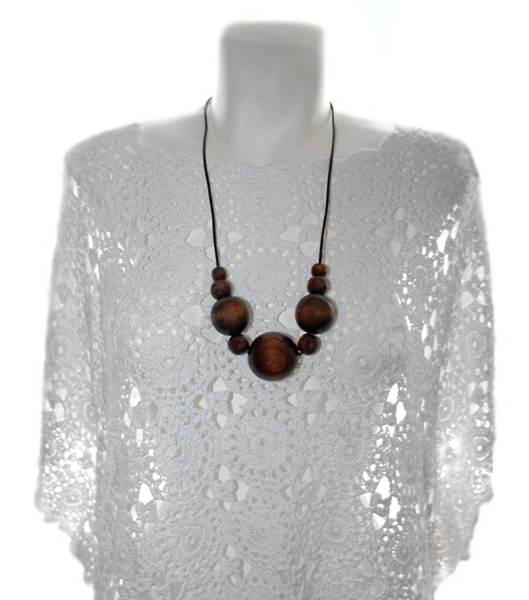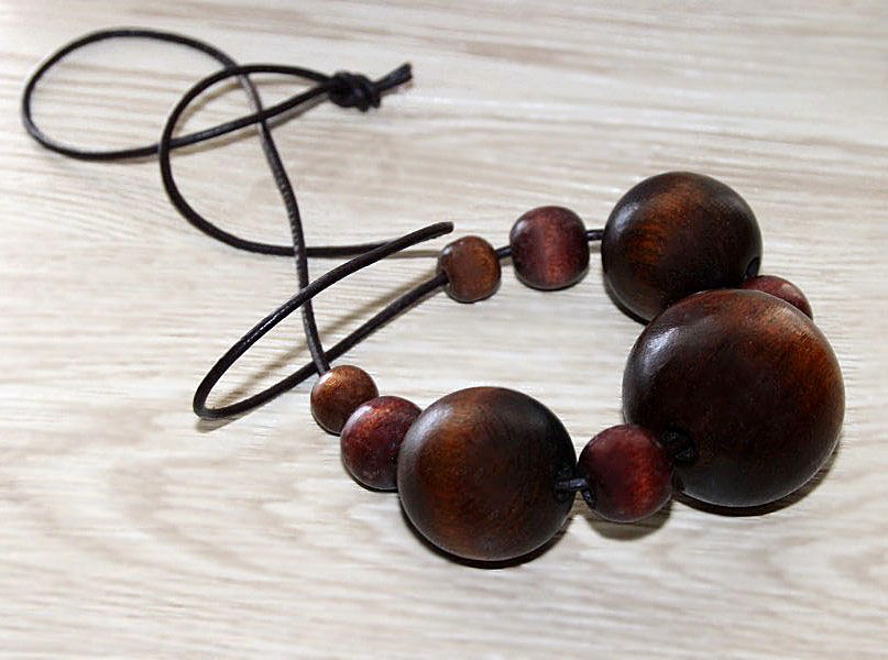 Erineva suurusega pruunide puidust helmestega kaelakee tumepruuni nahast paelaga.