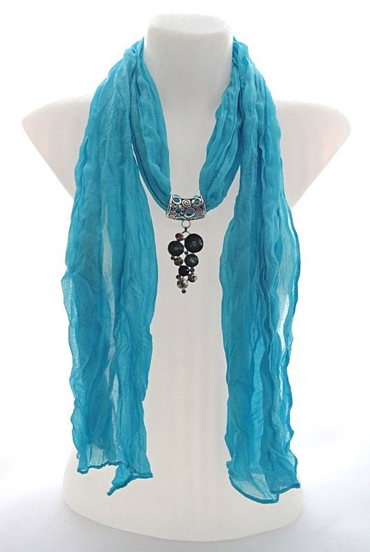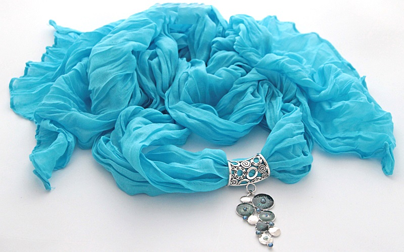 Erksast taevasinist värvi viskooskangast pikk sall etno stiilis hõbedase sallihoidja ja erinevate sinistes toonides ning hõbedavärvi ümmargustest detailidest koosneva metallripatsiga. Efektvärvide ja kristallvaiguga kaetud ning taevasiniste klaaskristallidega kaunistatud metallripatsi mõõdud on 3,5 cm x 7 cm.