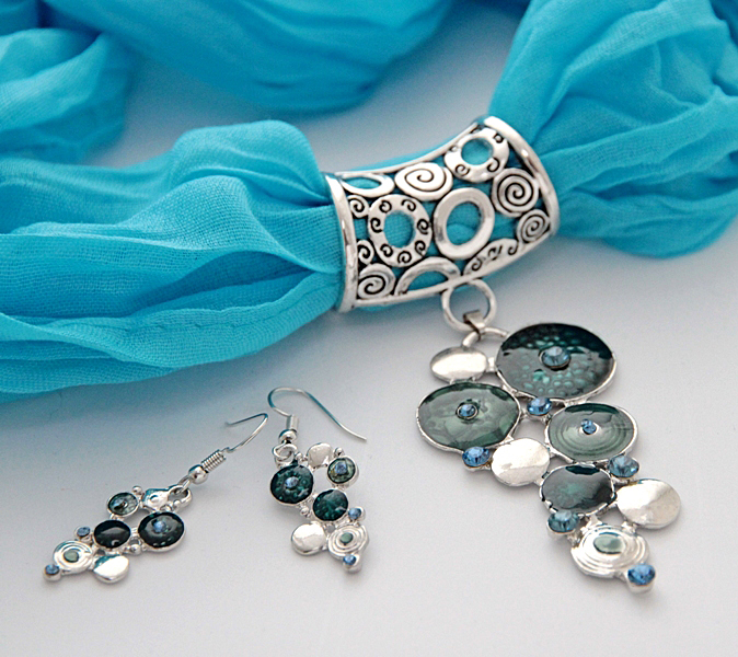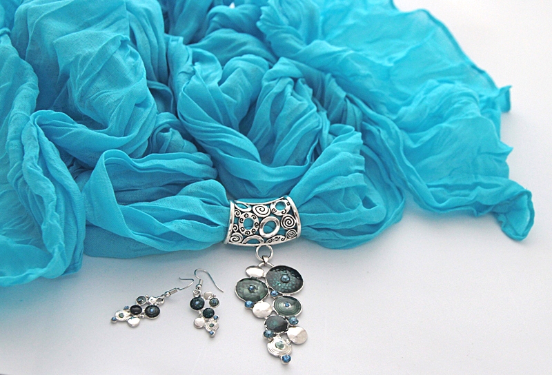 Erksat taevasinist värvi sall sinistes toonides metallripatsitest ehtekomplektiga