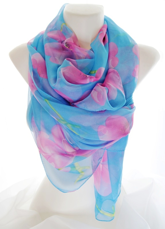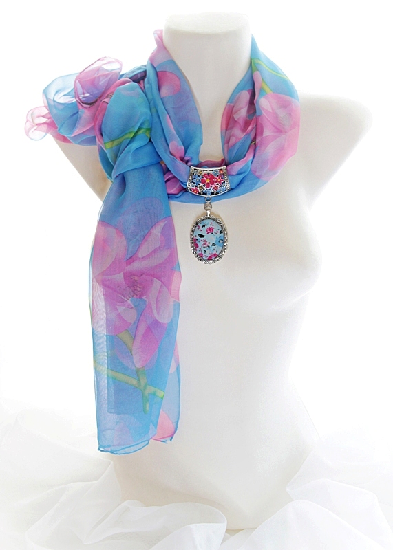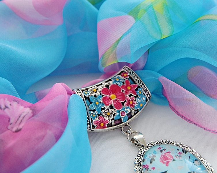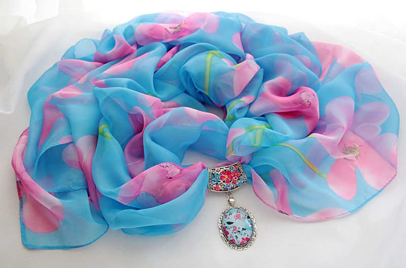 Suurte roosade lilleõitega taevasinist värvi sall antiikhõbedavärvi lillemustrilise sallihoidja ning sinise-roosakirju lillemustrilise kameeripatsiga. Sallihoidja lillemuster on salli toonides käsitsi värvitud, kaunistuseks lisatud väike särav roosat värvi klaaskristall. Antiikhõbedavärvi pitsilises metallraamis helesinisel põhjal lillemustrilise klaaskameega ripatsi mõõdud on 4 cm x 6 cm. Hästilangeva siidiselt pehme ja õhulise polüesterkangast suuremat salli mõõdud on 70 cm x 180 cm.