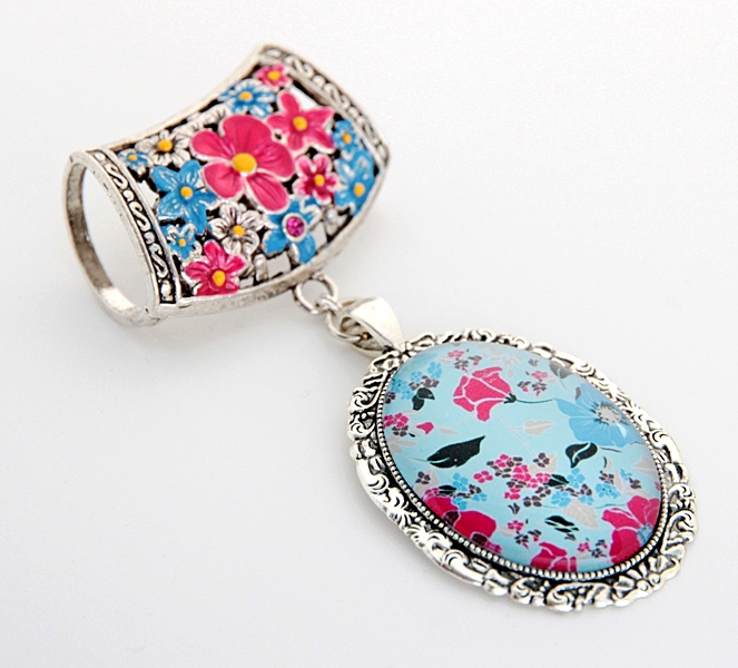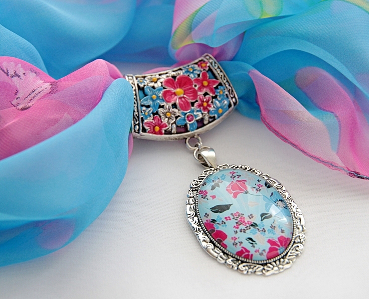 Roosade lilledega taevasinine sall lillemustrilise sallihoidja ja kameeripatsiga