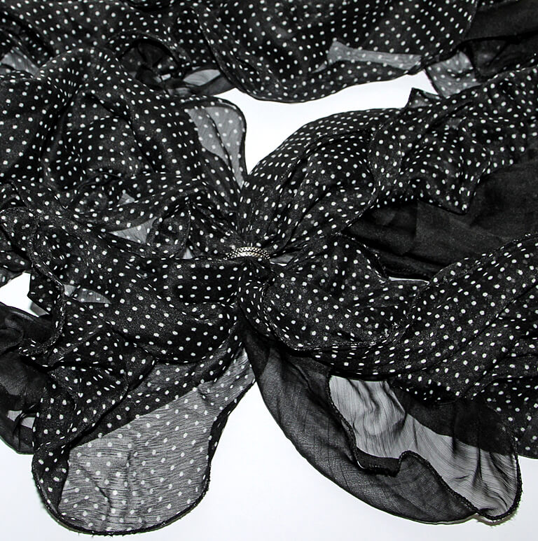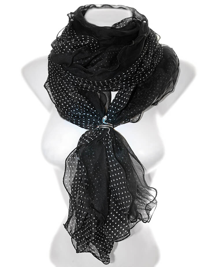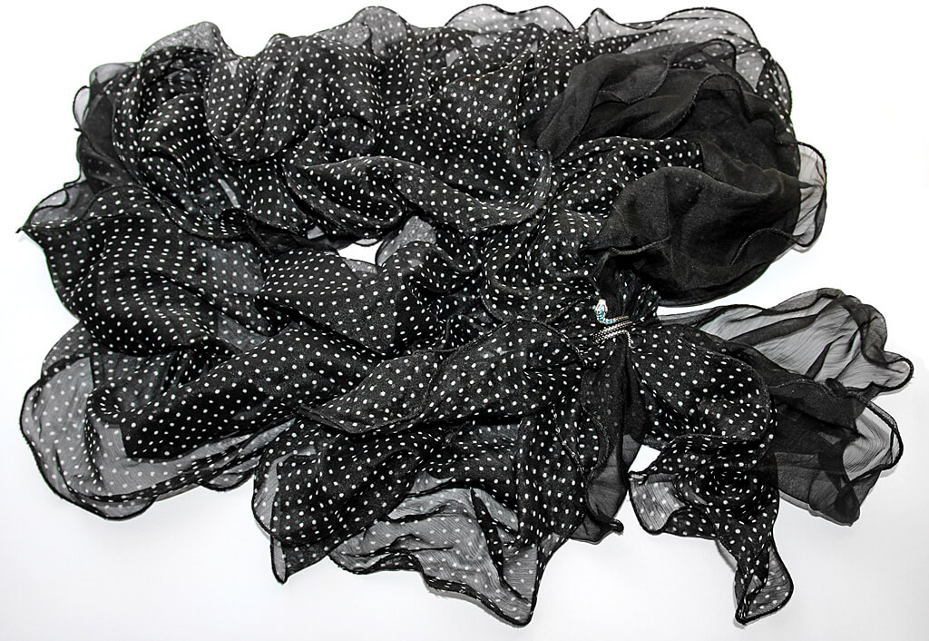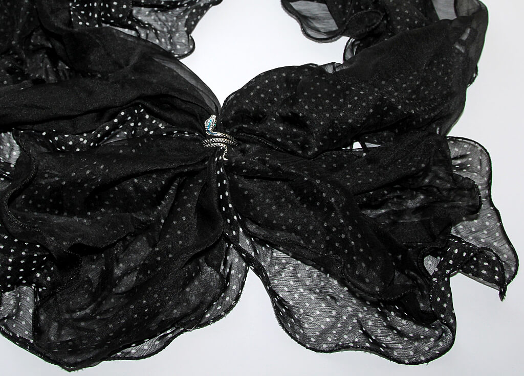 Valgetäpilisest ja mustast õhukesest šifoonist volangsall efektse ussikujulise antiikhõbedavärvi sallihoidjaga. “Ussi pea” on kaunistatud säravate meresiniste klaaskristallidega. Kangale eriliselt õhulise ja koheva efekti andmiseks on kaks salli on omavahel keskelt kumminiidiga kokku õmmeldud, ääred tamiiliga lokkivaks töödeldud. Salli pikkus on ca 210 cm, laius 40 cm.