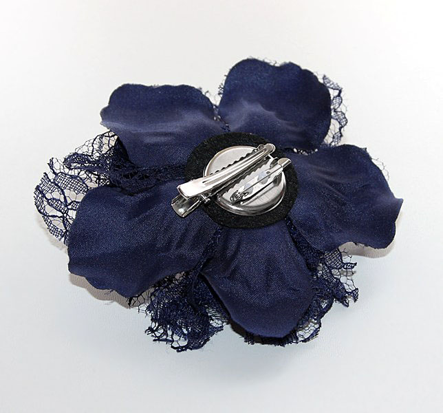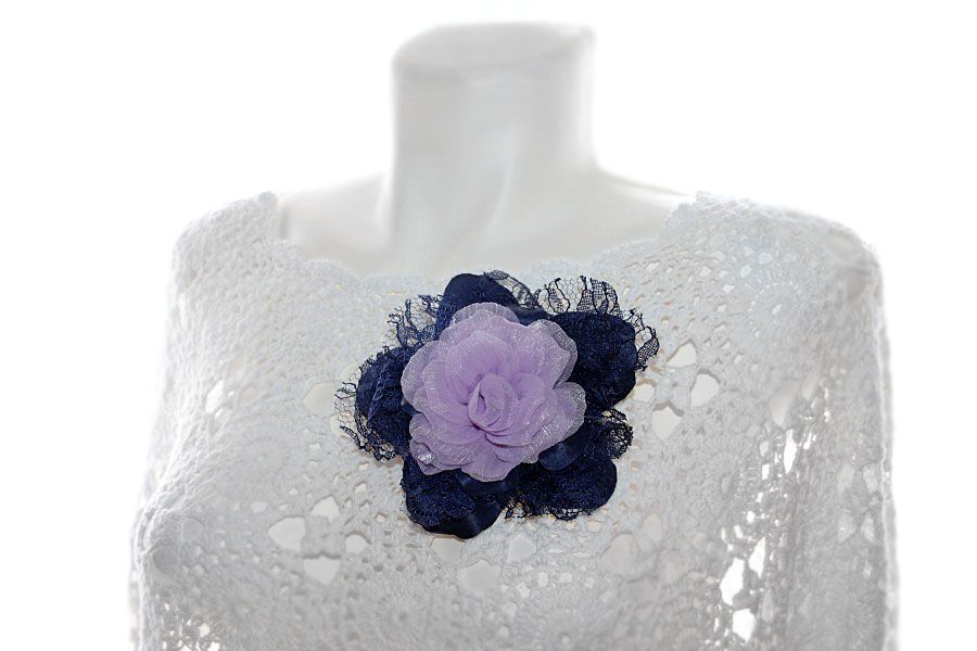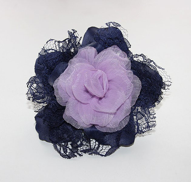 Kaunilt sädelevast helelillast organzakangast roosiõie ning tumesinisest pits- ja satiinkangast “lehtedega” pross. Tumesinine satiinkangas on immutatud ja tugevaks vormitud.