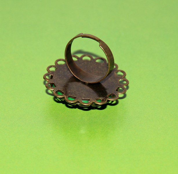 Pronksivärvi pitsilise aluse ja kauni ümmarguse roosimustrilise Tensha* kameega sõrmus. Rohelisepõhjalise kamee suurus on 2 cm. Koos pitsilise äärega on sõrmuse pealmise osa suurus 3 cm, rõngas on reguleeritava suurusega.