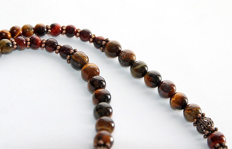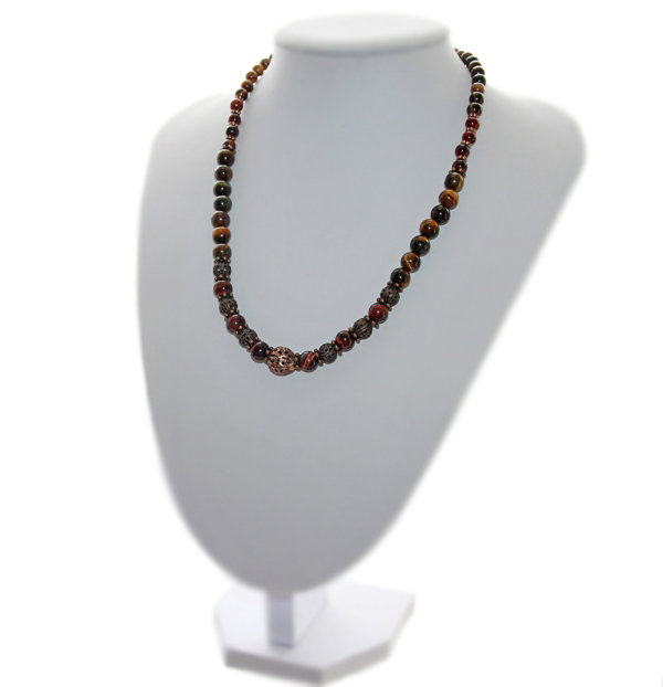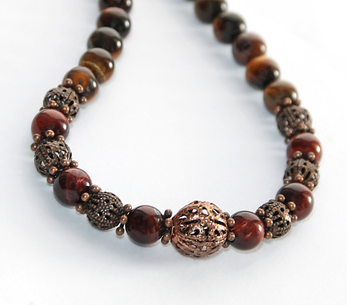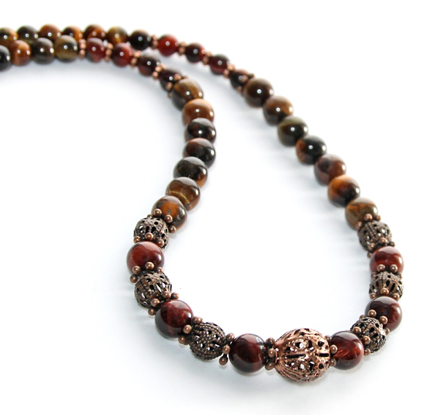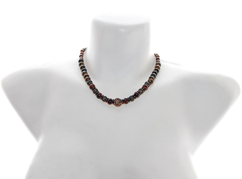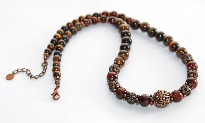 Kaunilt küütlevate punakat ja kollakas-rohelist tooni tiigrisilmahelmestest kaelakee vasevärvi kaunistusdetailide ja pitspallidega. Kaelakees on kasutatud kahes suuruses helmeid diameetriga 6mm ja 8mm.
