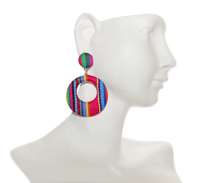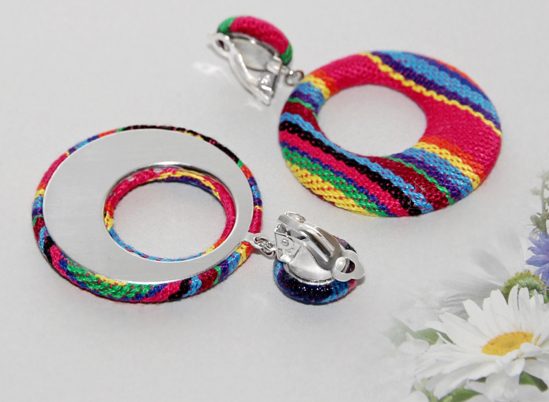 Triibukangaga kaetud ümmarguste detailidega kõrvarõngad hõbedavärvi klõpsuga. Kõrvarõngaste tagumine osa on töödeldud hõbedavärvi õhukese alumiiniumist metall-lehega. Kõrvarõngaste pikkus koos triibukangaga kaetud kinnisega on 6 cm, ümmarguse ripatsi suurus on 4 cm. Kõrvarõngad on väga kerged ning “toeka” klõpskinnisega hästi kõrvalesta küljes püsivad.
