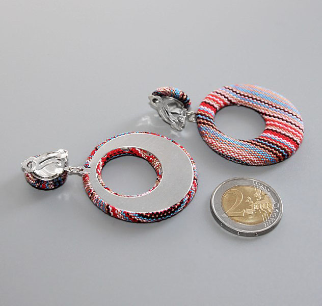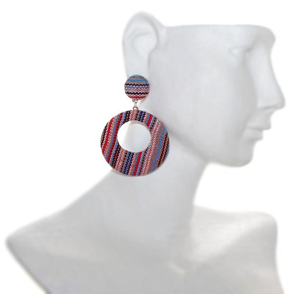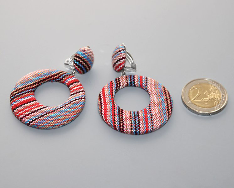 Triibukangaga kaetud ümmarguste detailidega kõrvarõngad hõbedavärvi klõpsuga. Kõrvarõngaste tagumine osa on töödeldud hõbedavärvi õhukese alumiiniumist metall-lehega. Kõrvarõngaste pikkus koos triibukangaga kaetud kinnisega on 6 cm, ümmarguse ripatsi suurus on 4 cm. Kõrvarõngad on väga kerged ning “toeka” klõpskinnisega hästi kõrvalesta küljes püsivad.