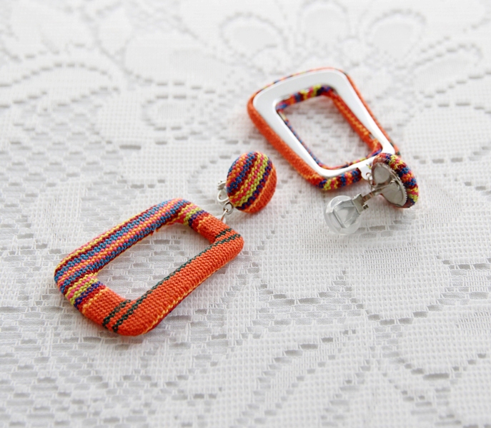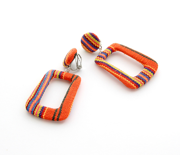 Triibukangaga kaetud kandiliste detailidega kõrvarõngad klõpsuga. Kõrvarõngaste tagumine osa on töödeldud hõbedavärvi õhukese alumiiniumist metall-lehega. Kõrvarõngaste kindlamaks kõrvalesta küljes püsimiseks on väikesele hõbedavärvi klõpskinnisele lisatud silikoonist kate, mida saab soovi korral ka ära võtta. Kõrvarõngaste pikkus koos triibukangaga kaetud kinnisega on 6 cm, kandilise ripatsi mõõdud on 3 cm x 4 cm.