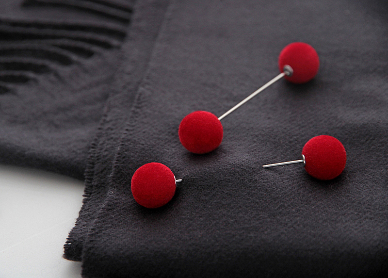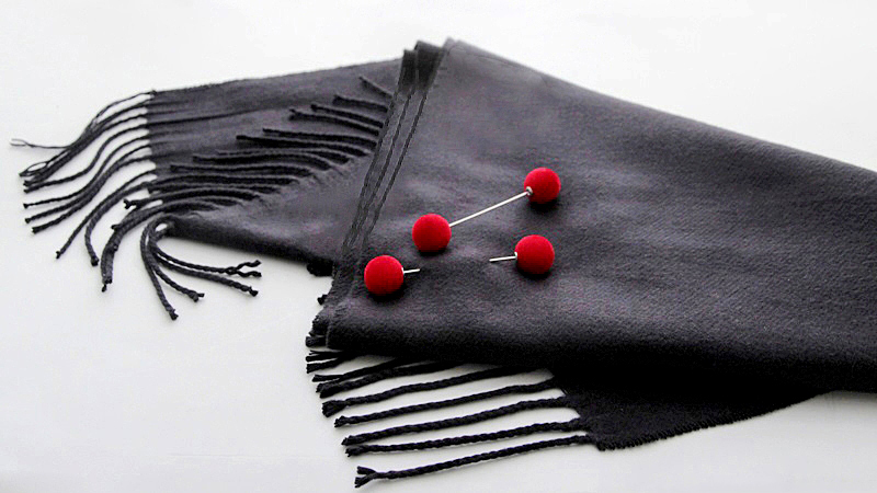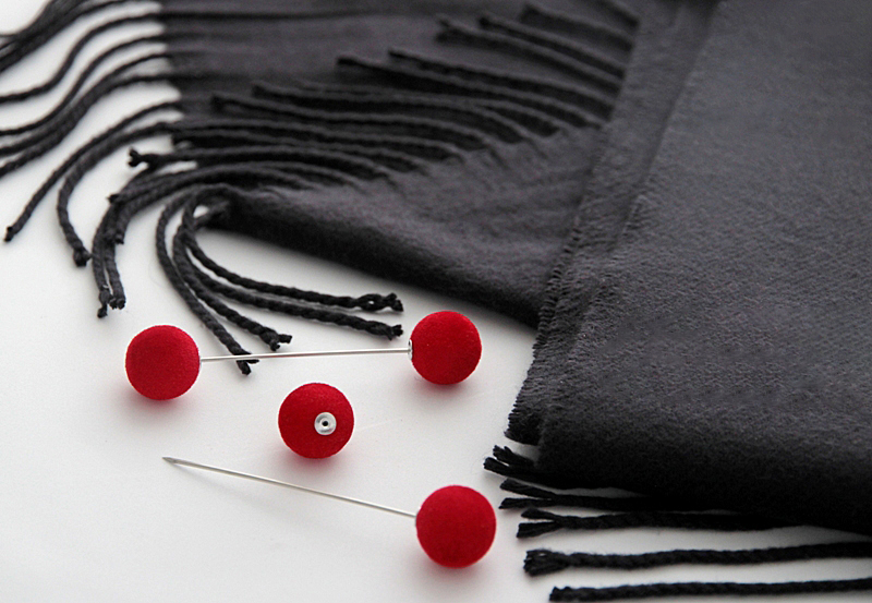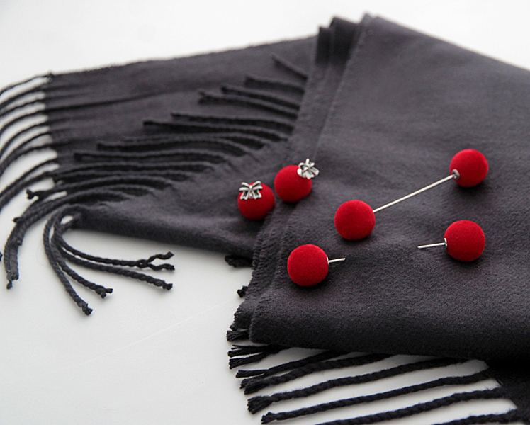 Tumehalli värvi pehmest kašmiirist narmastega salli punastest samethelmestest kaunistusnõelte ja kahepoolsete kõrvarõngastega. Salli laius on 30 cm ja pikkus (ilma narmasteta) on 170 cm. Kaunite sügavpunaste samethelmeste suurus on 16mm. Komplekti kuuluvaid samethelmestega kahepoolsete kõrvarõngaste väikeseid lipsukujulisi poltkõrvarõngaid on võimalik kanda ka ilma tagumise helmeta (kaasas 1 paar poldi kinnitustaguseid). Musta emailiga kaetud hõbedavärvi lipsukese suurus on 7mm x 10mm.