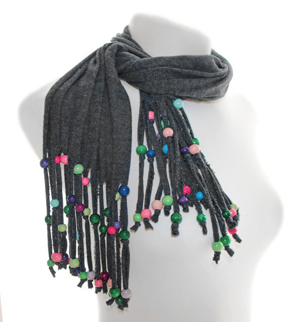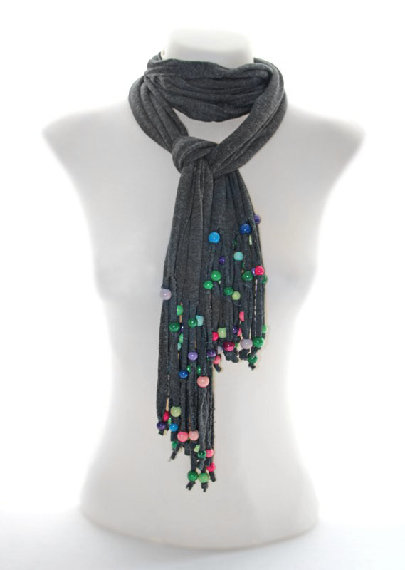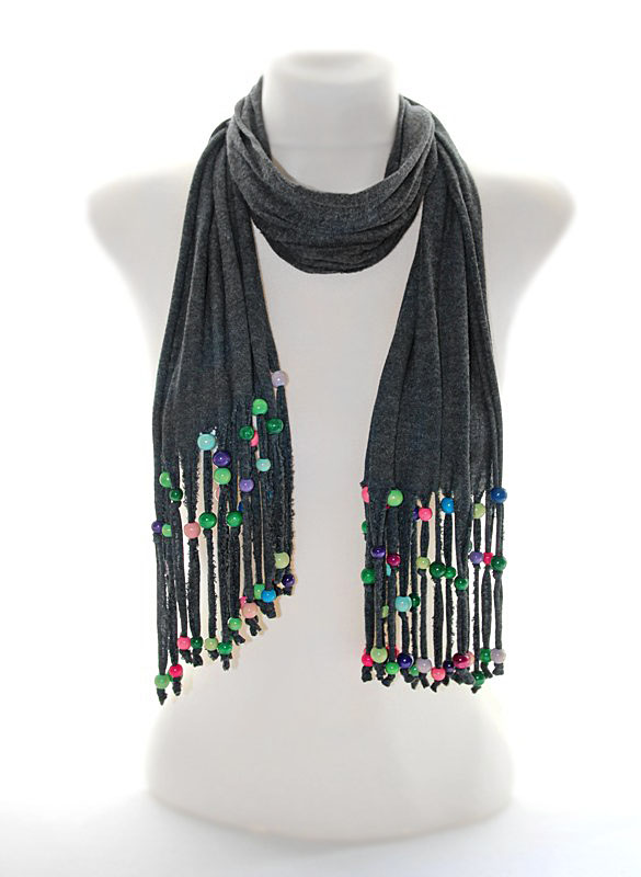 Tumehallist puuvilla ja elastaanisegu trikotaažist sall narmastatud otstesse kinnitatud värviliste puuhelmestega.