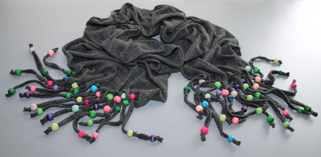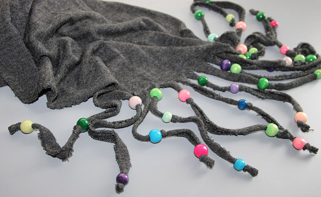 Trikotaažkangast väljalõigatud salli ääred on jäetud töötlemata ning ribadeks lõigatud salli otsad ja ääred on seetõttu taotluslikult “karvased”.