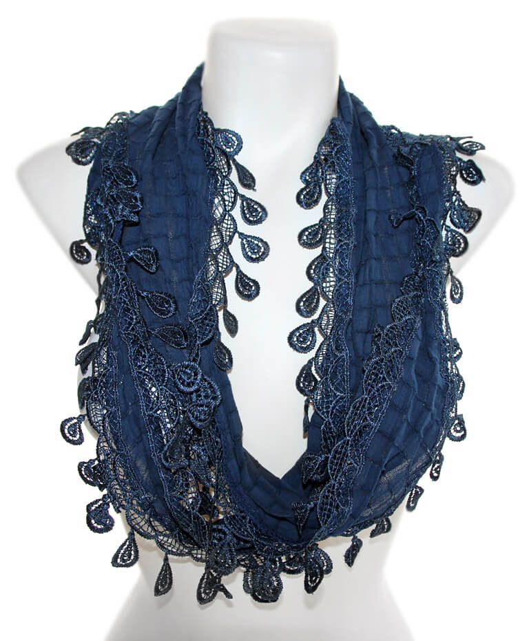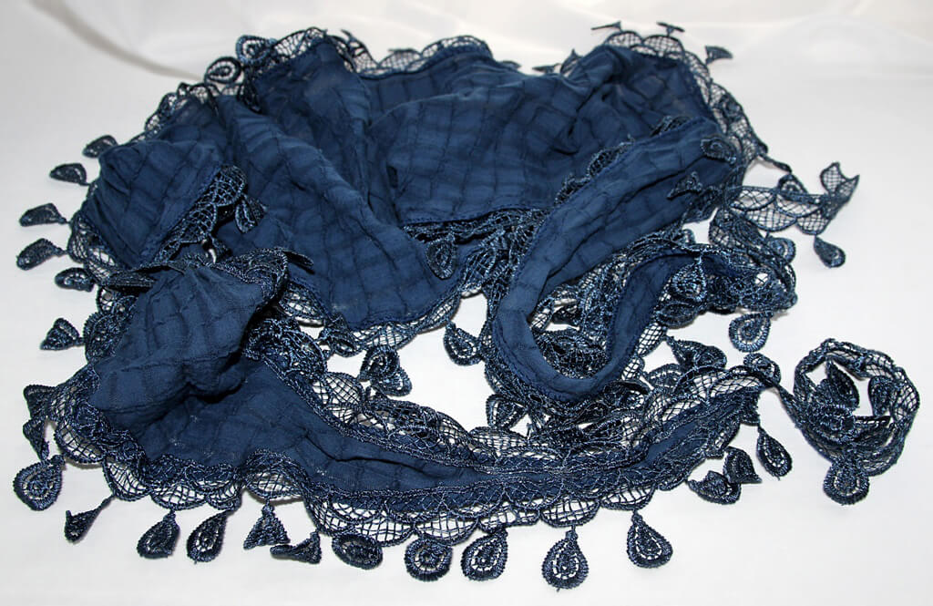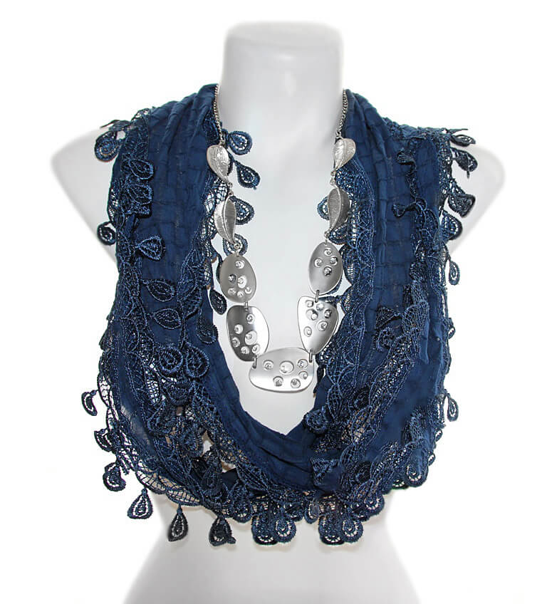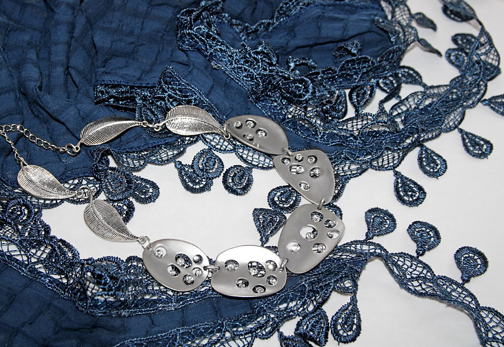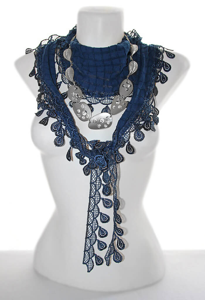 Kergelt läikivast lehemotiividega polüesterpitsist äärega puuvilla- ja viskoosisegu tumesinine pikk sall komplektis hõbedavärvi metalldetailidest kaelaehtega.