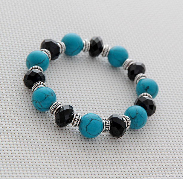 Ümmarguste sünteetiliste türkiiskivide, antiikhõbedavärvi vahehelmeste ning säravate lihvitud mustade klaashelmestega käevõru