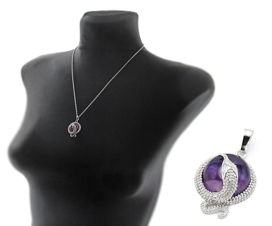 Efektse hõbedavärvi ussikujulise raami ja kauni, kergelt läbipaistva lilla ümmarguse kameeripatsiga kaelakett.