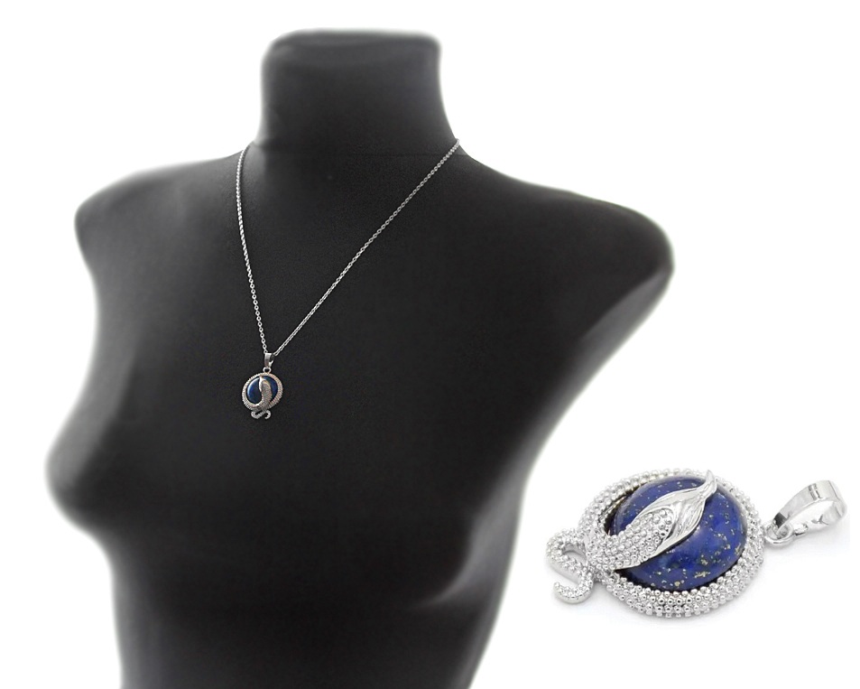Efektse hõbedavärvi ussikujulise raami ja kauni, kullaträpsulise sügavsinise lasuriidi (Lapis Lazuli) ümmarguse kameeripatsiga kaelakett.