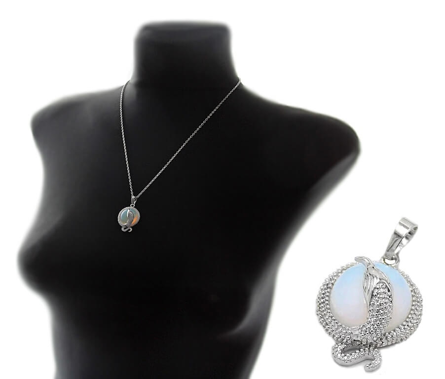 Efektse hõbedavärvi ussikujulise raami ja kauni, valguse käes erinevates värvitoonides helkleva ümmarguse kameeripatsiga kaelakett.