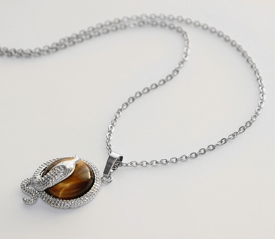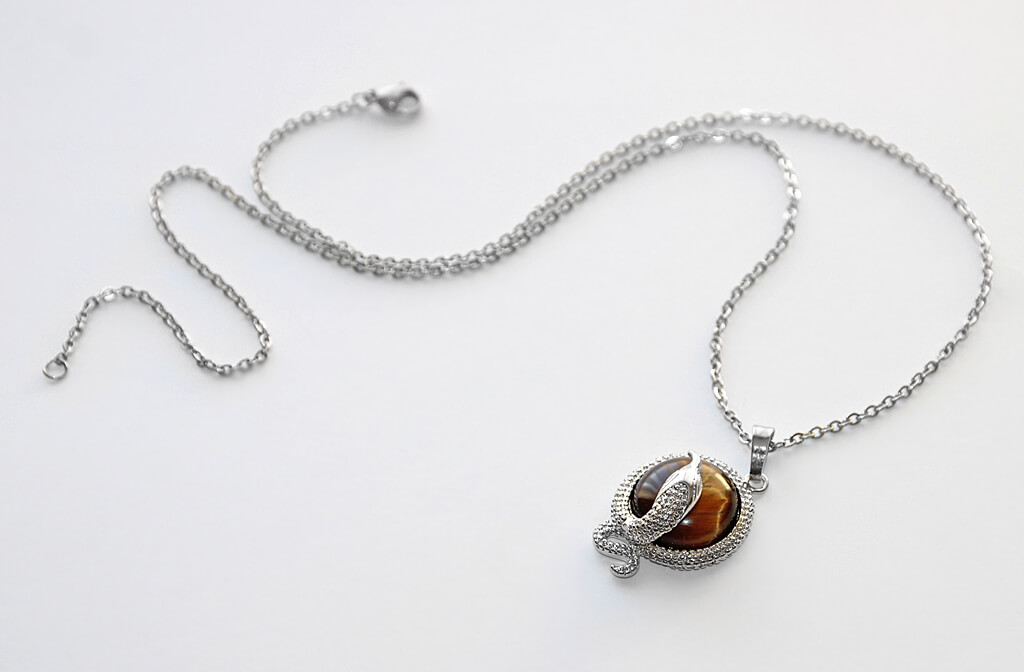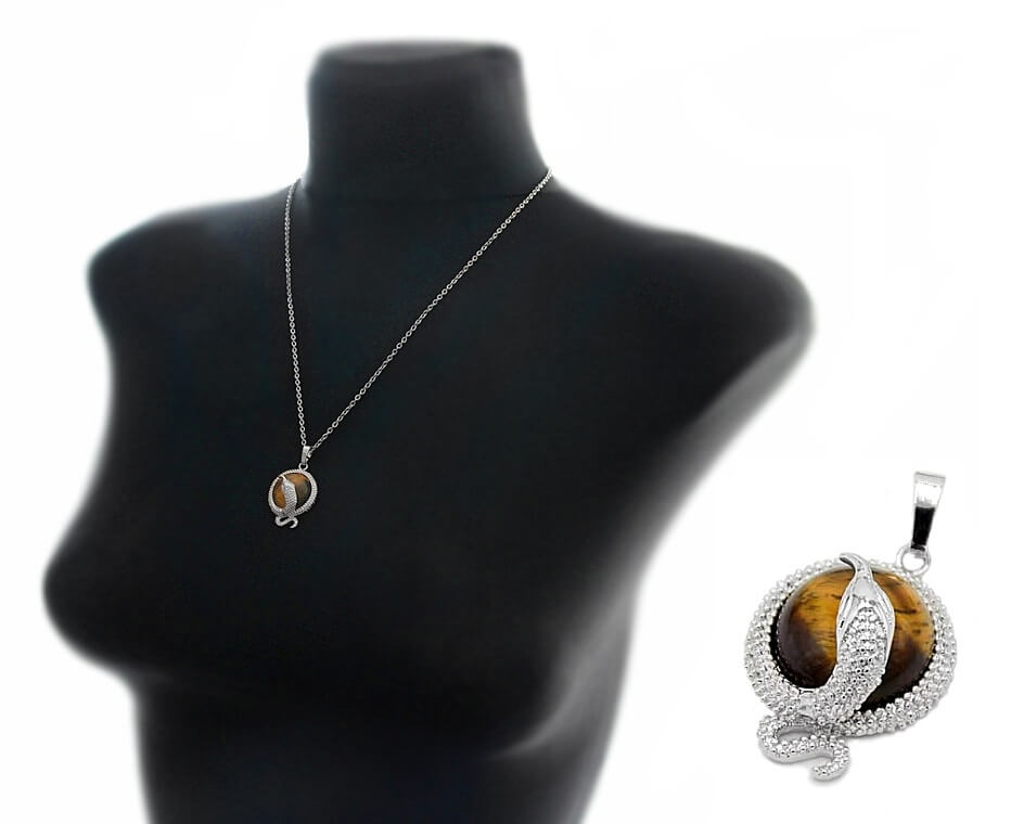 Efektse hõbedavärvi ussikujulise raami ja valguse käes kaunilt küütleva tiigrisilmakivist ümmarguse kameeripatsiga kaelakett.