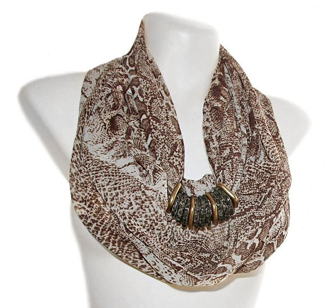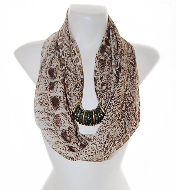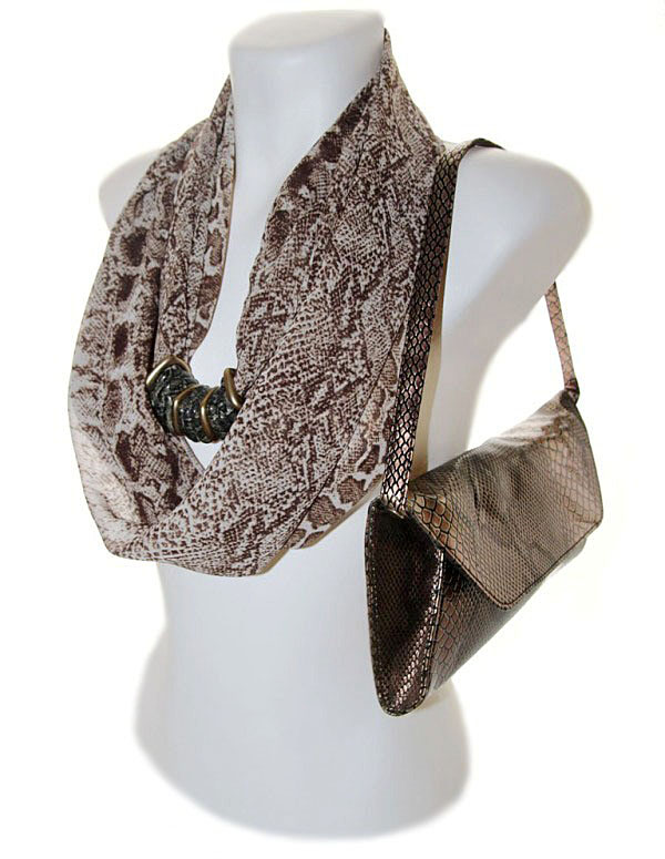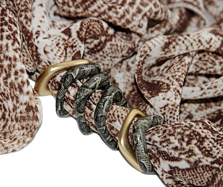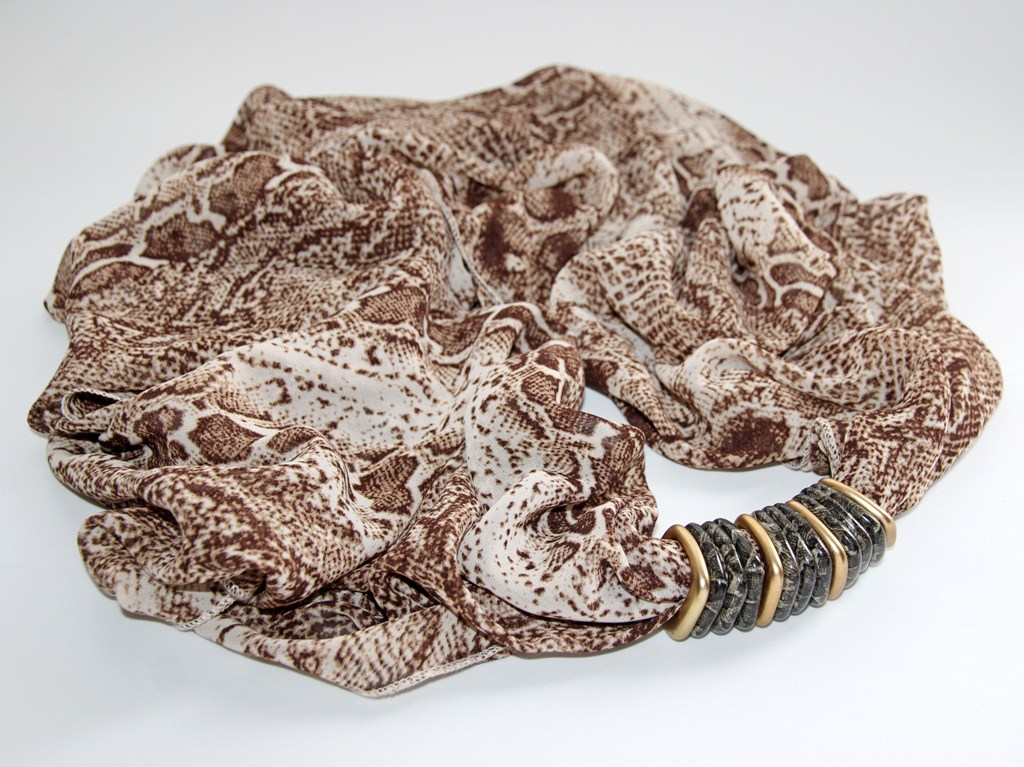 Ussinahamustrilisest pruuni-beezikirjust polüesterkangast rull-sall kuldsete ja ussinahamustriliste kandiliste akrüülist kaunistusdetailidega. Detailid on sallil “lahtiselt” ning neid saab erinevat moodi “komplekteerida” kandes neid kas kõik koos ühtse reana või ka detaile eraldi sallile paigutades.