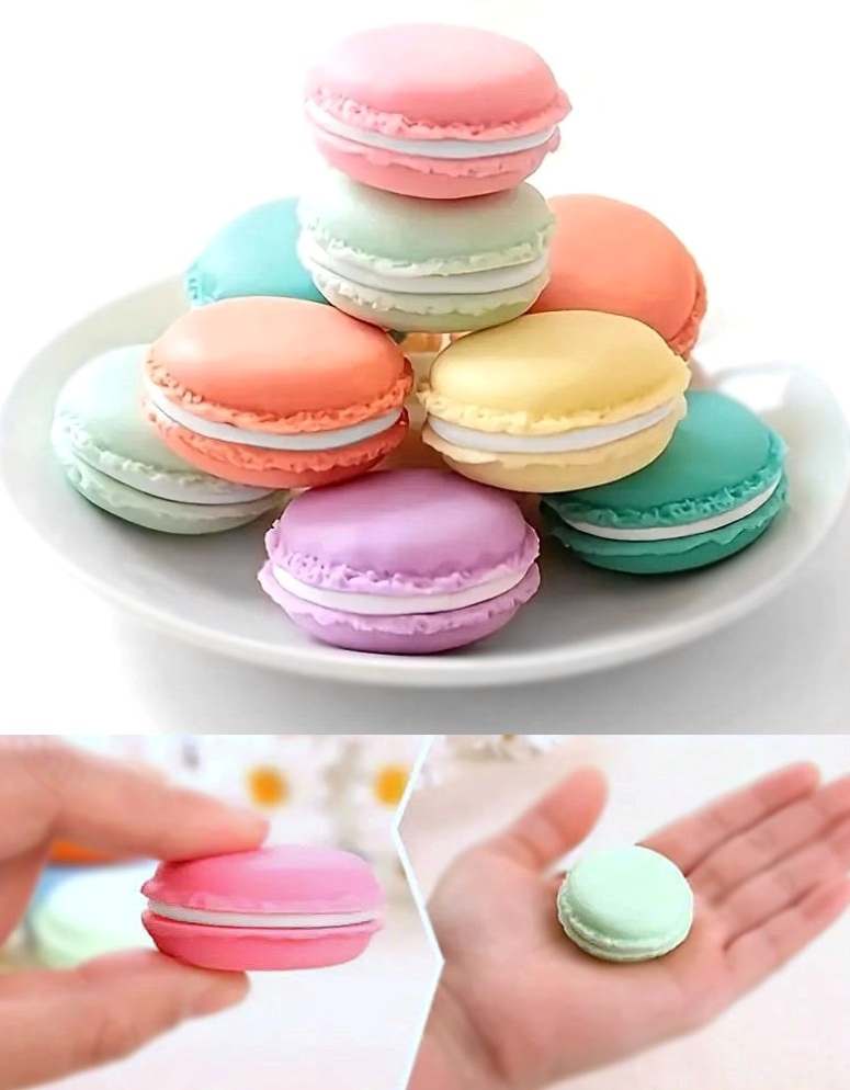Väike roosa makroonikujuline pehmest plastikust (silikoonist) ehtekarbike.