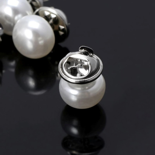 Valge akrüülpärliga väike kaunistus-kinnituspross. Pärli suurus on 12mm (võrdluseks: 1-sendise mündi suurus on 16mm).