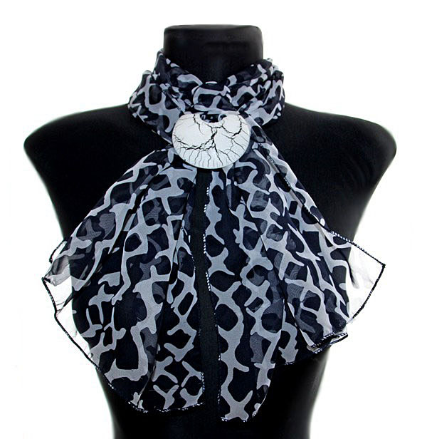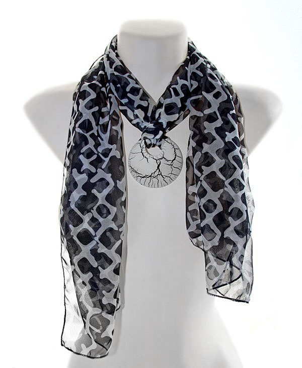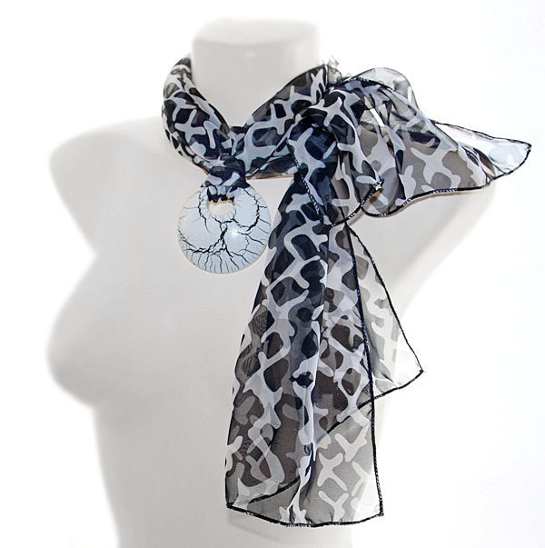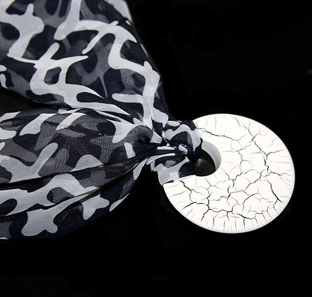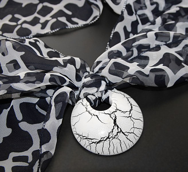 Valge-mustakirjust õhukesest polüesterkangast väike sall suure ümmarguse kraklee-tehnikas kaunistatud puidust ripatsiga. Kaunistusdetail on sallile efektselt kinnitatud läbi detailis oleva suure augu.