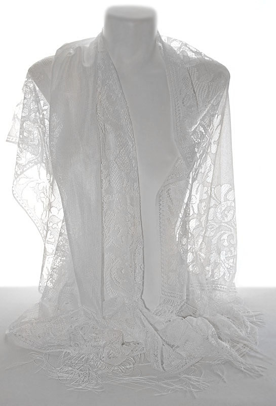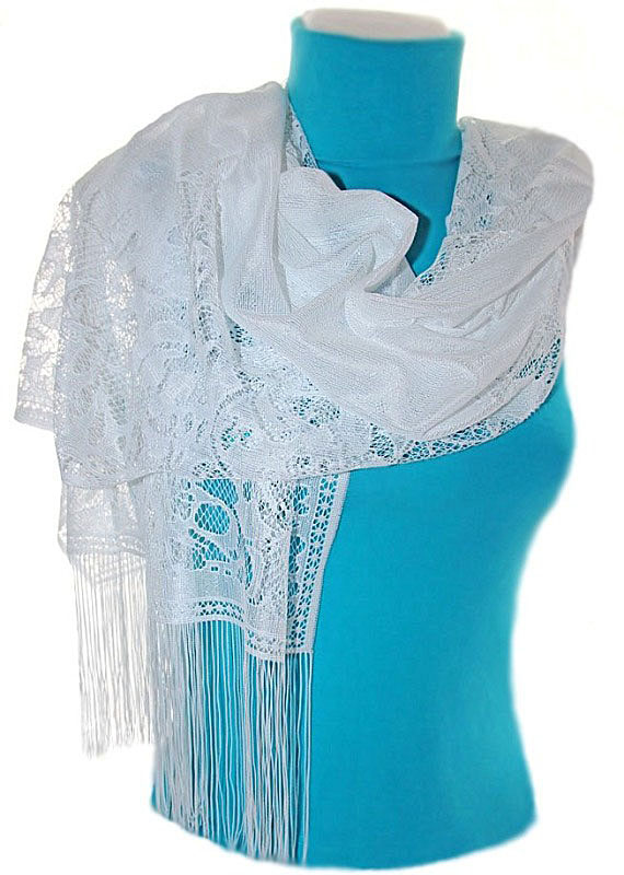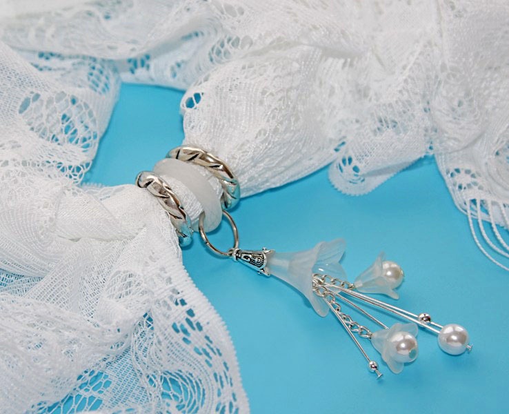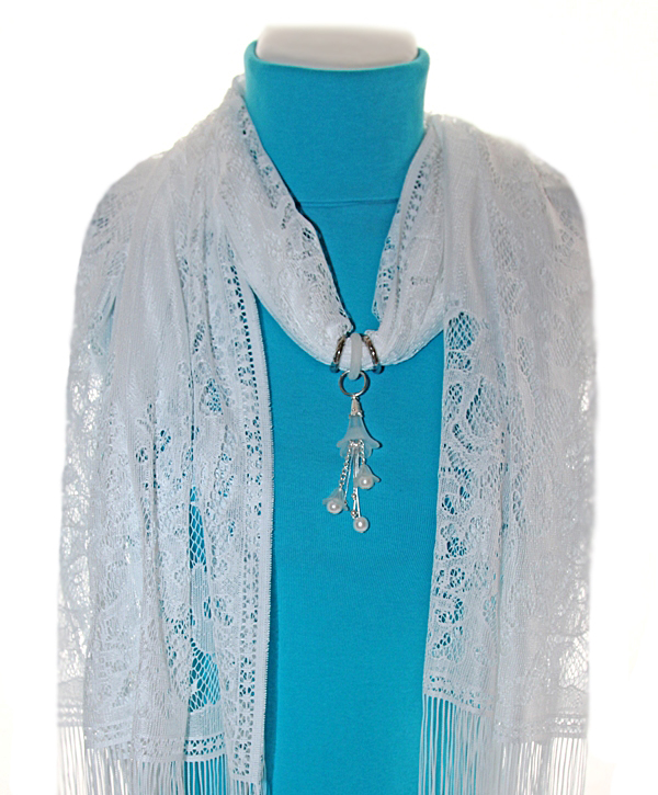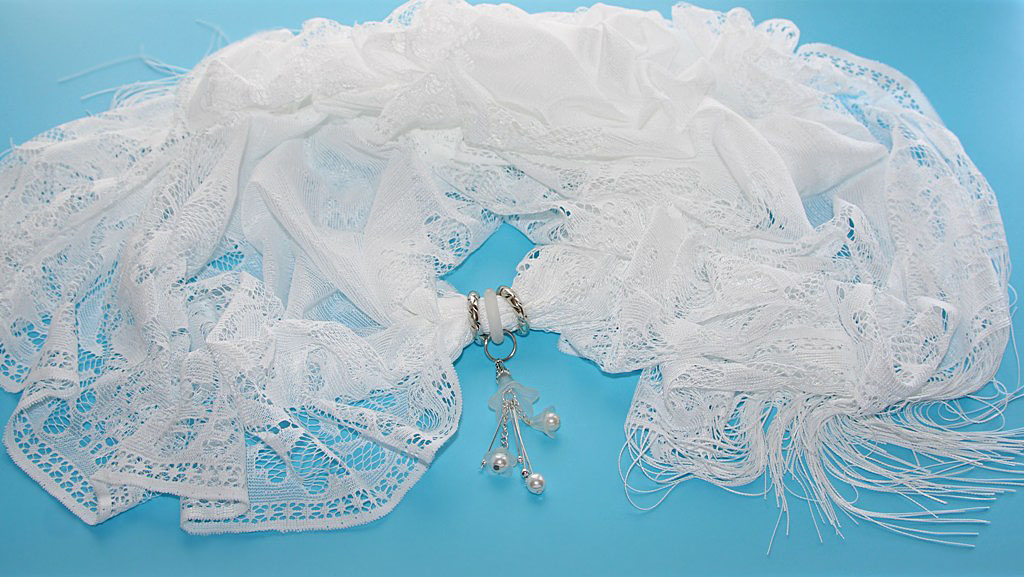 Lumivalget värvi pitsilisest polüesterkangast pikk narmastega sall kinnitusrõngaste ja kellukakujulistest kaunistusdetailidest ripatsiga. Poolläbipaistvatest mattidest kellukakujulistest Lucite* detailidest, väikestest valgetest pärlitest ja hõbedavärvi kaunistusdetailidest koosnev ripats on kinnitatud valge mati akrüülist rõnga külge. Ripatsi pikkus on 8 cm.
