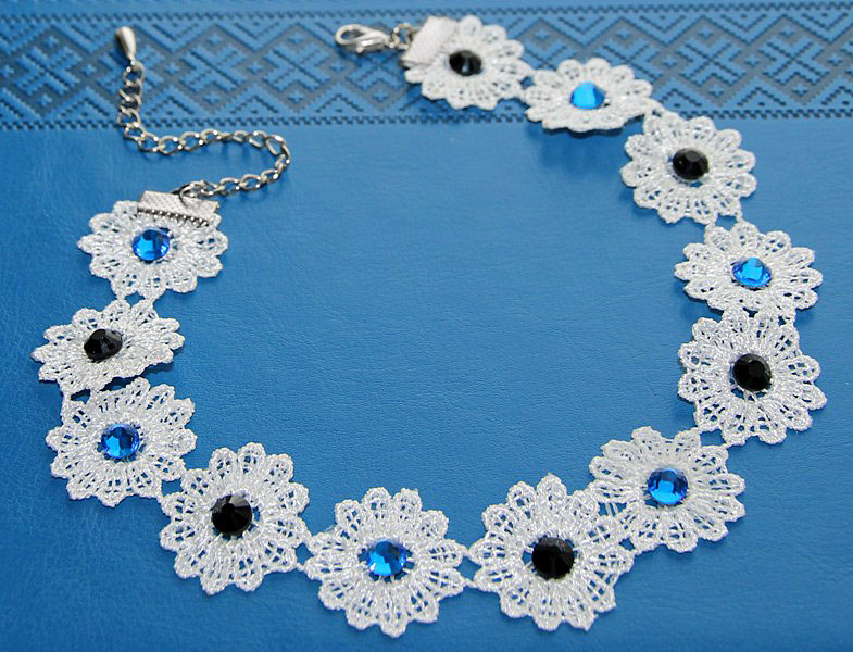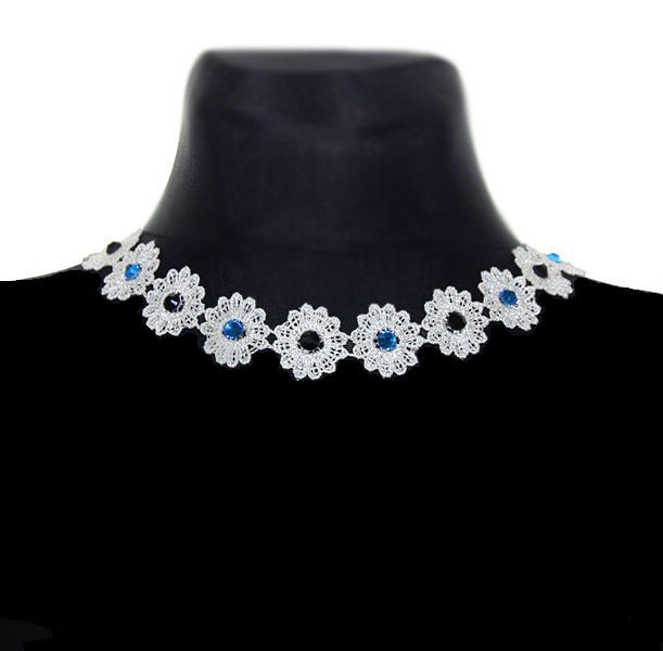 Siniste ja mustade sätendavate tšehhi kristallidega kaunistatud õrnast valgest lillemotiividega pitsist pidulik choker-stiilis kaelaehe.