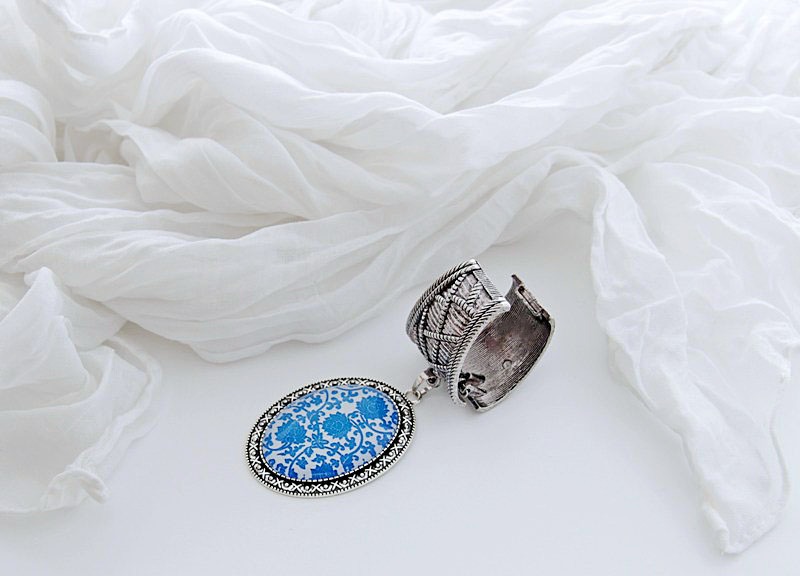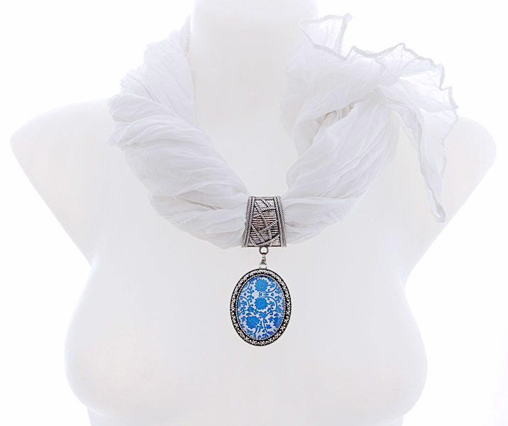 Valget värvi pehmest viskooskangast sall antiikhõbedavärvi sallihoidja ja metallraamis lillekirju kameeripatsiga. Metallist sallihoidja on vedruga ja pealt avatav ning seda saab kergesti sallile kinnitada. Sinise-valgekirju rahvuslikus stiilis lillemustrilise klaaskameega ripatsi mõõdud on 3,5 cm x 5 cm. Salli kangas on efektselt kortsutatud. Salli laius on laius ca 50 cm, pikkus 180 cm