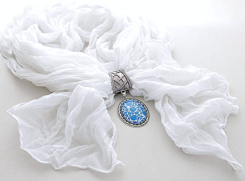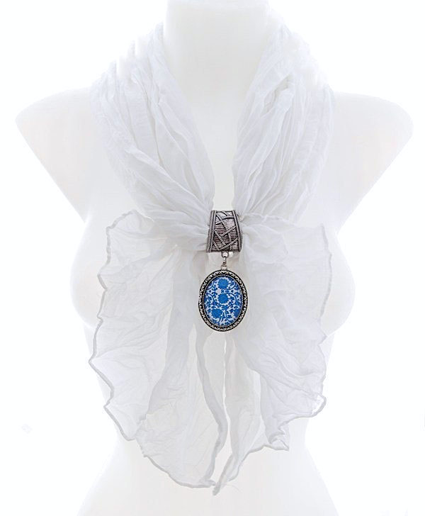 Valge sall antiikhõbedavärvi sallihoidja ja lillekirju kameeripatsiga