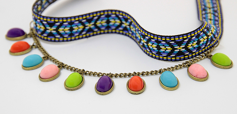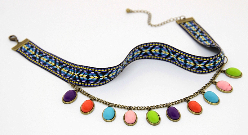 Pronksivärvi keti külge kinnitatud erivärvilistest kameedest ripatsite ja mustrilise paelaga choker (ümber kaela) stiilis kaelakee komplektis kõrvarõngastega. Kaelakee pikkus on reguleeritav karabiinkinnise ja pikendusketi abil 36 cm-st kuni 44 cm-ni. Erivärviliste akrüülkameede suurus on 14mm x 18mm, rahvusmustrilise paela laius on 2 cm.