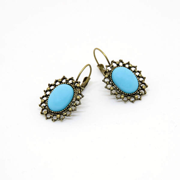 Komplekti kuuluvate pronksivärvi pitsilise raami ja taevasinise kameega kõrvarõngaste pikkus on 3 cm