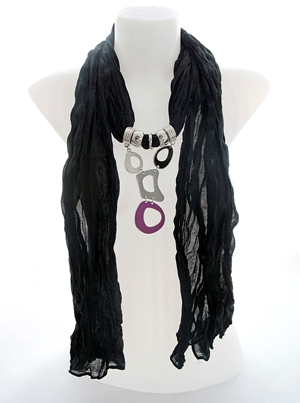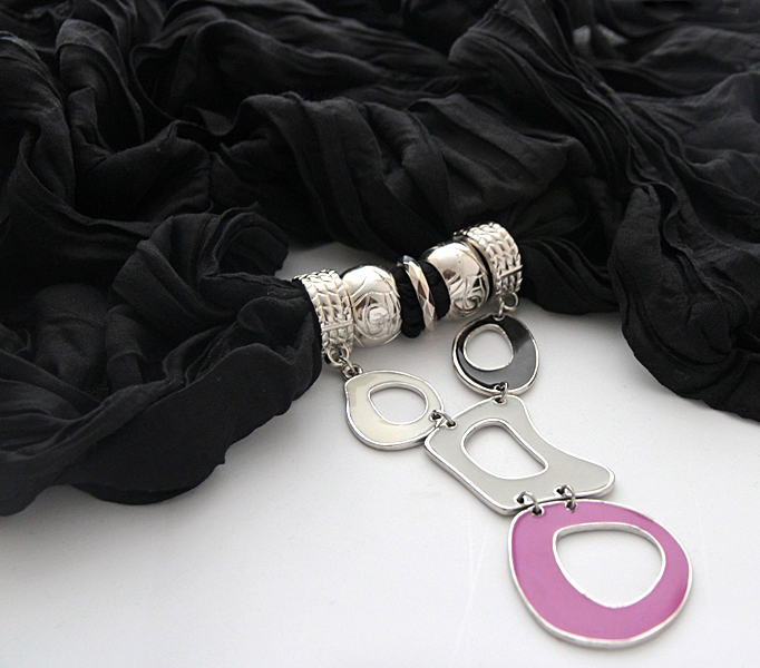 Musta värvi pehmest viskooskangast pikk sall hõbedavärvi kinnitusrõngaste ja ebasümmeetriliste värviliste kaunistusdetailidega. Erineva suuruse ja kujuga metalldetailid on kaetud eri värvi emailkattega. Salli kangas on efektselt kortsutatud, salli laius on ca 50 cm, pikkus 180 cm.