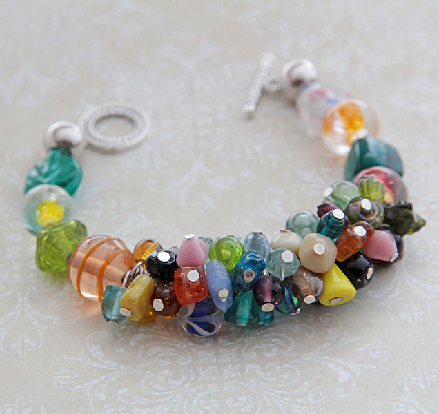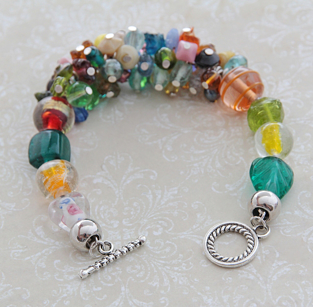 Käsitööna valminud erineva suuruse ja kujuga värvilistest klaashelmestest (lampwork) käevõru antiikhõbedavärvi T-kinnisega. Käevõru sobib suuremale randmeümbermõõdule (kuni 21 cm)