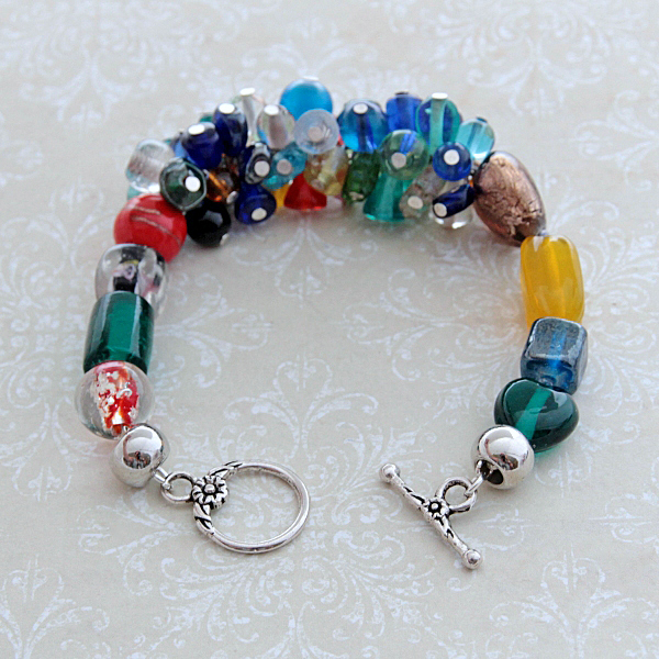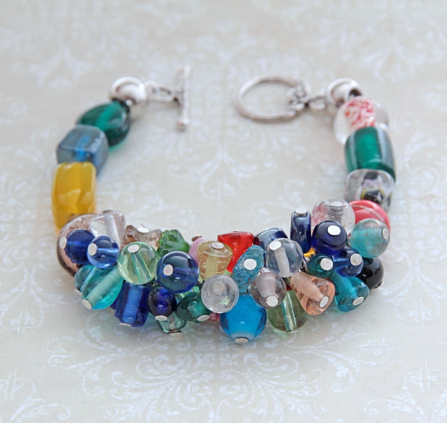 Käsitööna valminud erineva suuruse ja kujuga värvilistest klaashelmestest (lampwork) käevõru antiikhõbedavärvi T-kinnisega. Käevõru sobib randmeümbermõõdule kuni 17,5 cm