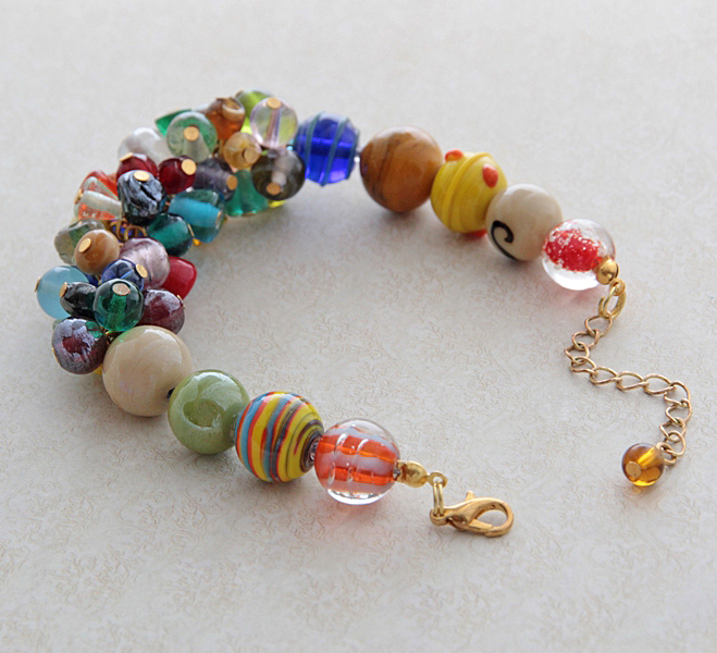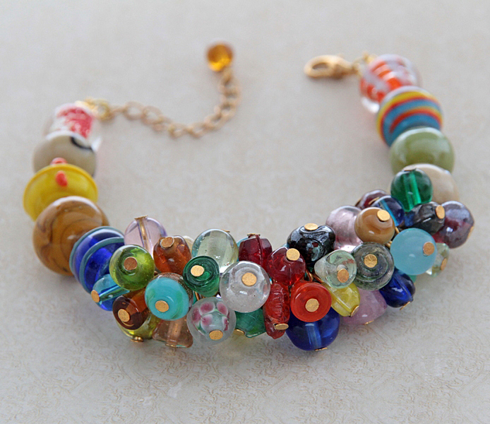 Käsitööna valminud erineva suuruse ja kujuga värvilistest klaashelmestest (lampwork) käevõru väikese kullavärvi karabiinhaagi ja ketiga. Käevõru sobib randmeümbermõõdule 16 cm-st kuni 20 cm-ni