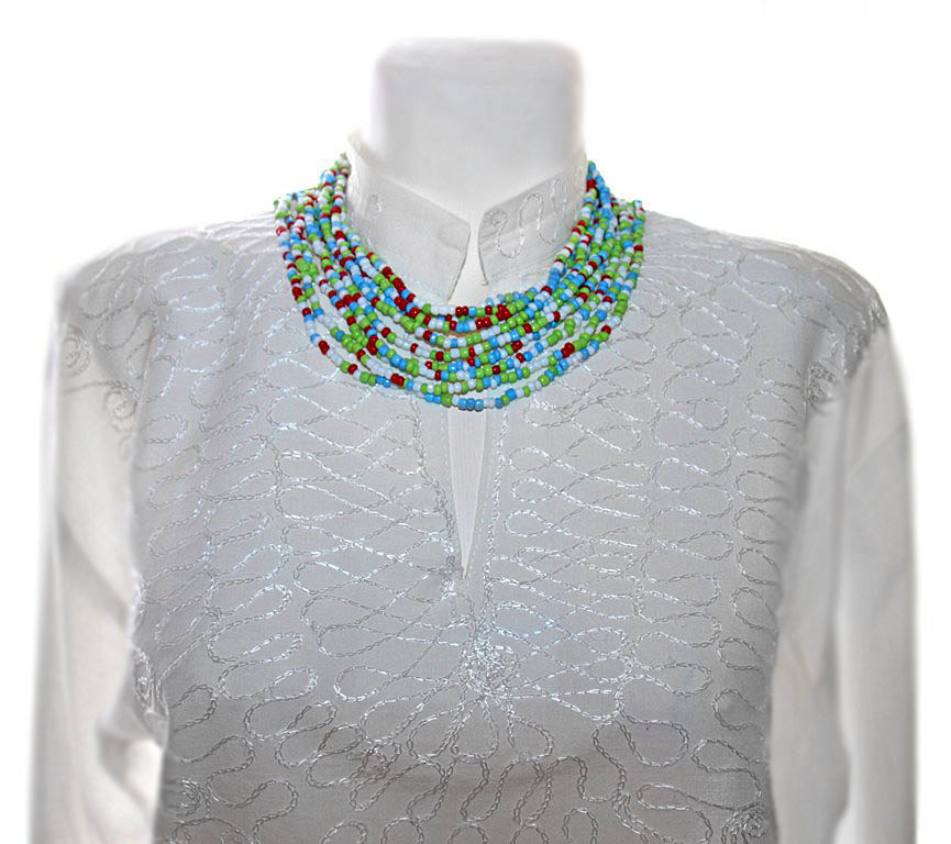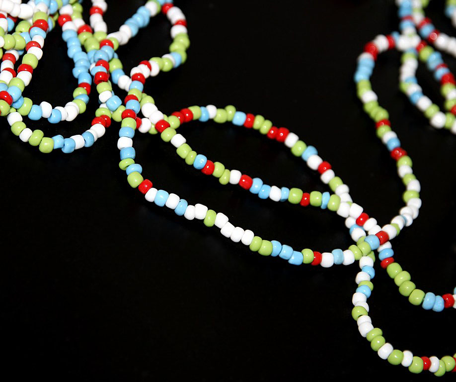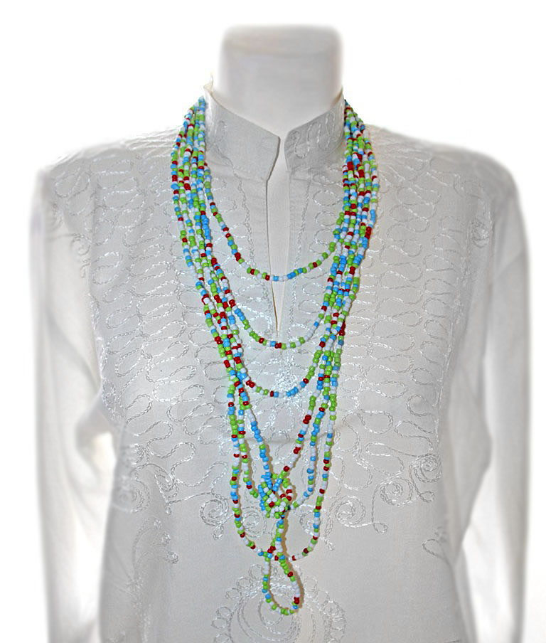 Väikestest valgetest, punastest, helesinistest ja helerohelistest klaashelmestest pikk kaelakee.