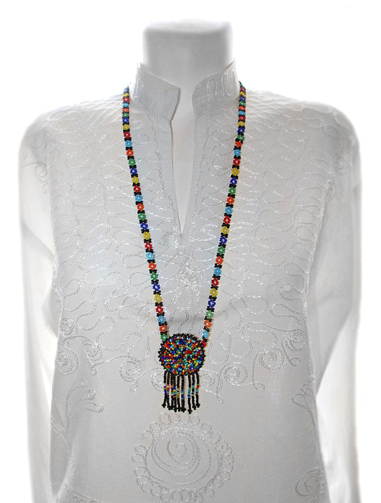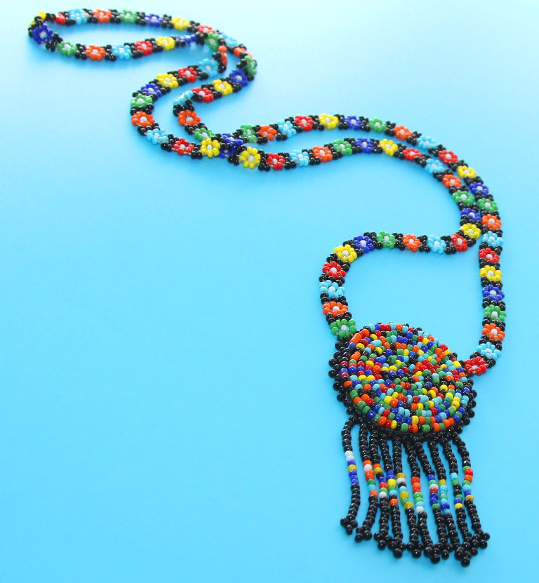 Erksavärvilistest väikestest seemnehelmestest kaelakee lillemotiivide ja suure ümmarguse ripatsiga.