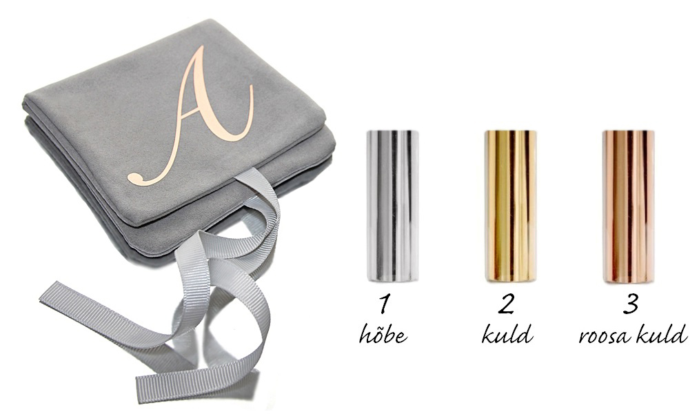 NB! Enne tellimuse kinnitamist kirjuta kindlasti teadete lahtrisse tekst (nimi või nimetähed), mida pealetrükiks soovid ning märgi number, missuguse värviga fooliumtrükki soovid.
