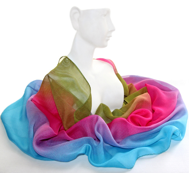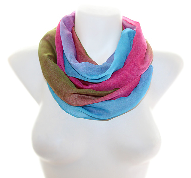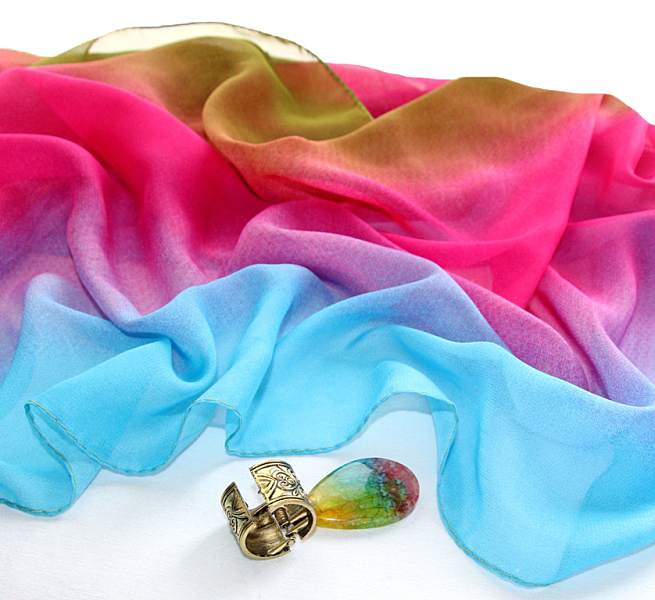 Vikerkaarevärvilisest polüesterkangast rull-sall antiik-kuldset värvi sallihoidja ning värvilise tilgakujulise ahhaatkivist ripatsiga. Salli otsad on kokku õmmeldud ning sall on kantav rullina ümber kaela. Väike etnomustriline metallist sallihoidja on vedruga ja pealt avatav ning seda saab kergesti sallile kinnitada. Efektselt “mõralise” vikerkaarevärvides ahhaatkivist ripatsi mõõdud on 3 cm x 4,5 cm. Siidjalt pehme ja õhulise hästilangeva salli laius on 48 cm, salli pikkus (kokkuõmmelduna täisringi ümbermõõt) on 130 cm.