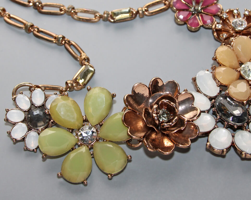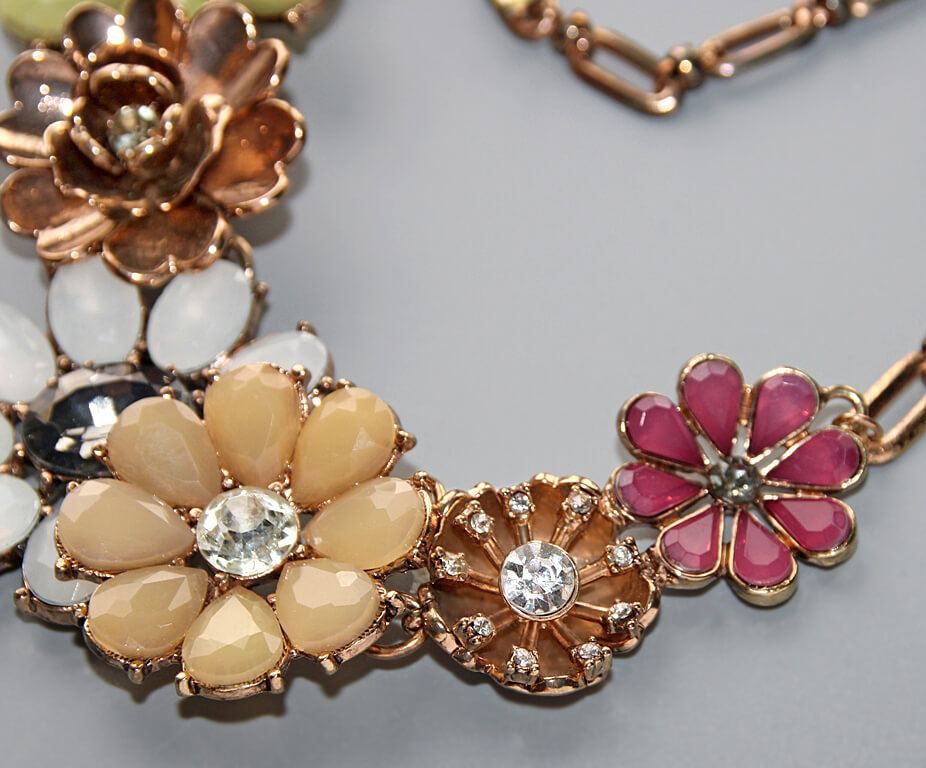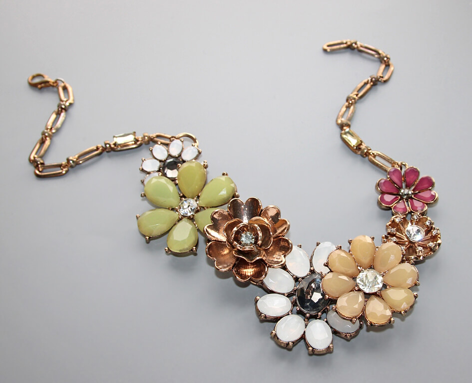 Erinevate pastell (“murtud”) toonides akrüülkameede ja säravate klaaskristallidega kaunistatud lilleõiemotiividega antiik-kuldset värvi kaelakee.