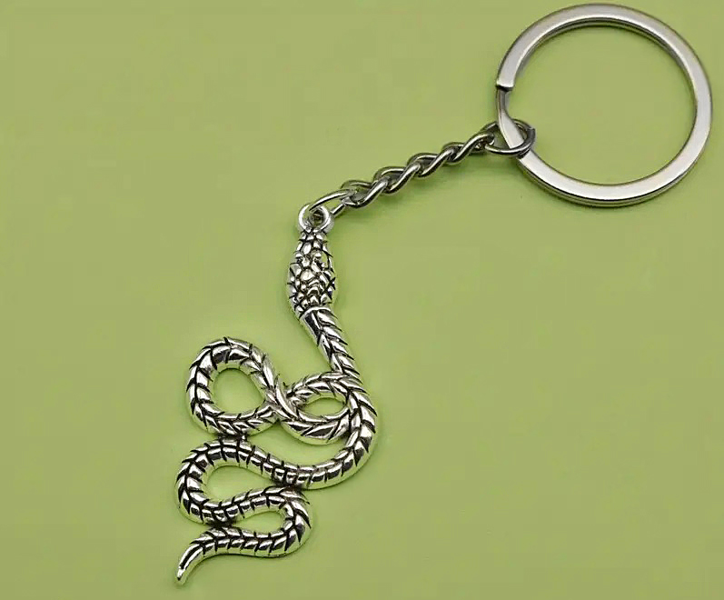 Antiikhõbedavärvi stiliseeritud ussikujulise metallripatsiga võtmehoidja. Rõnga läbimõõt on 2,5 cm, ripatsi pikkus koos ketiga on 8 cm. Ussikujulise detaili mõõdud on 2,6 cm x 5,3 cm.
