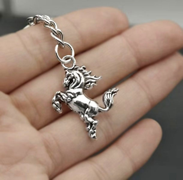 Keti külge kinnitatud perutava, tagajalgadele tõusnud hobuse kujulise metallripatsiga väike hõbedavärvi võtmehoidja.