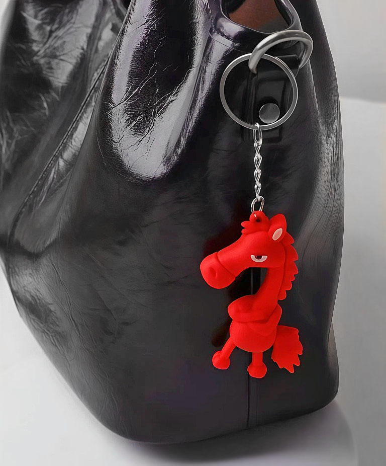Humoorikalt arrogantse välimusega hobusekujulise punase ripatsiga võtmehoidja hõbedavärvi keti ja rõngaga.