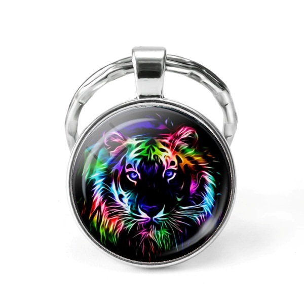 Ümmarguse hõbedavärvi metallraami ja stiliseeritud tiigri pea värvilise kujutisega mustapõhjalise klaaskameega võtmehoidja.
